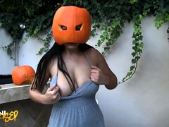 Chubby Asian teen TS masturbates tiny girl rod in the river